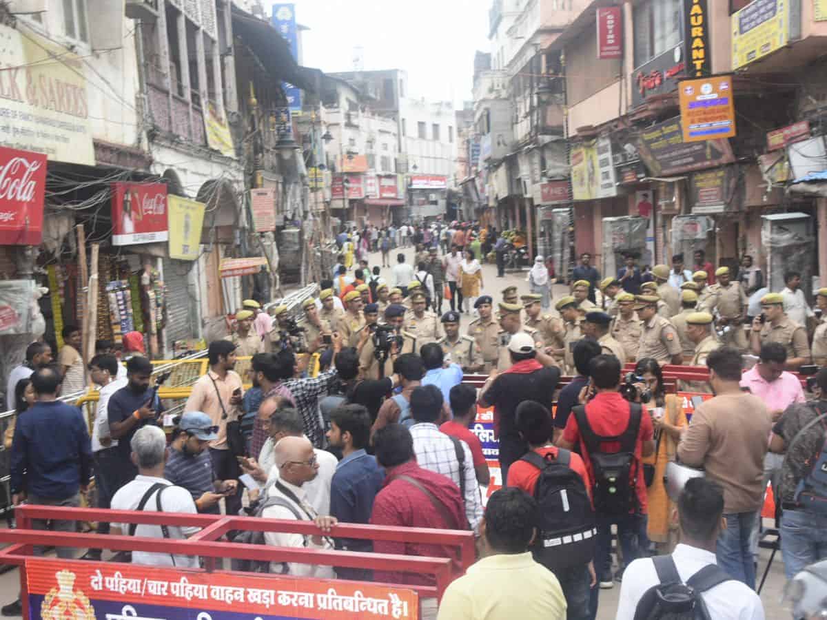 ज्ञानवापी मसले (Gyanvapi Survey) को लेकर कमिश्नरेट के द्वारा खाशा सतर्कता बरती जा रही है। ज्ञानवापी, काशी विश्वनाथ, गोदौलिया चौराहा, बुलानाला, मैदागिन सहित शहर के संवेदनशील इलाकों में पुलिस, आरएएफ, पीएसी, एलआईयू समेत अन्य सुरक्षा ऐजेसिंया चौकन्नी थीं। इधर, ज्ञानवापी सर्वे के मूवमेंट पर खुद पुलिस आयुक्त मुथा अशोक जैन और डीएम एस. राजलिंगम नजर बनाए हुए हैं। इसके अलावा काशी विश्वनाथ धाम के गेट नंबर चार की सुरक्षा ट्रू पैरा कमांडो के हवाले की गई है। मंदिर परिसर के एक किलो मीटर के दायरे में भी कमांडो गश्त कर रहे हैं। शनिवार को भी ज्ञानवापी आने-जाने वाले मार्ग पर पुलिस बरकेडिंग कर तैनात थी। केवल पैदल यात्रीयों को मंदिर की ओर जाने दिया जा रहा था।