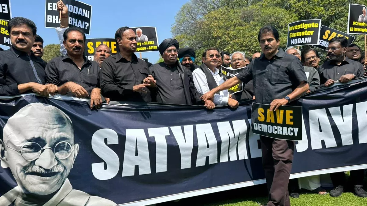 अदाणी समूह के मुद्दे पर विपक्षी सांसदों ने काले कपड़े पहनकर संसद में गांधी प्रतिमा के पास विरोध प्रदर्शन किया। कांग्रेस अध्यक्ष मल्लिकार्जुन खरगे और यूपीए अध्यक्ष सोनिया गांधी भी प्रदर्शन में शामिल हुईं।