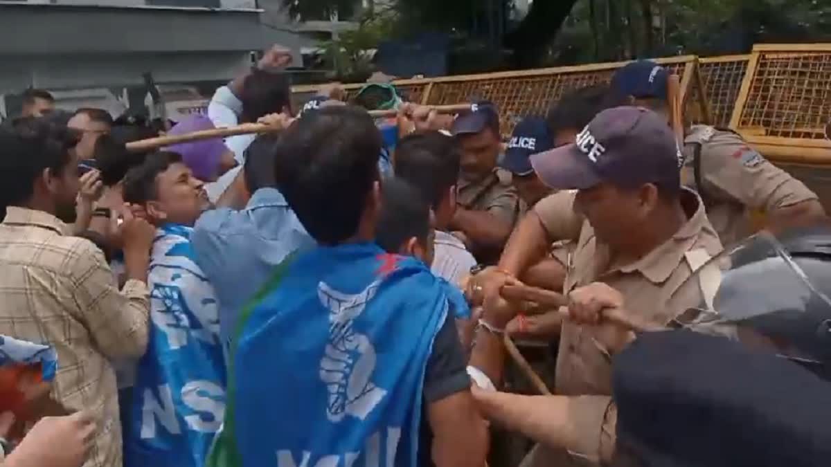 पुलिस ने ईडी ऑफिस से पहले ही प्रदर्शनकारियों को बैरिकेडिंग लगाकर रोक दिया। इस दाैरान पुलिस के साथ कार्यकर्ताओं की धक्कामुक्की भी हुई। इस बीच कार्यकर्ताओं ने जमकर नारेबाजी की।