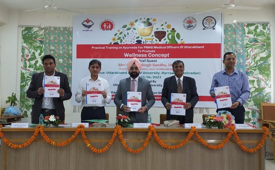 मुख्य सचिव द्वारा प्रशिक्षण कार्यक्रम में Practical Training on Ayurveda For PMHS Medical Officers of Uttarakhand To Promote Wellness Concept उत्तराखण्ड आयुर्वेद विश्वविद्यालय (Uttarakhand Ayurved University) तथा एच0एन0बी0 उत्तराखण्ड चिकित्सा शिक्षा विश्वविद्यालय द्वारा बनाये गये प्रशिक्षण मॉड्यूल का विमोचन किया गया।