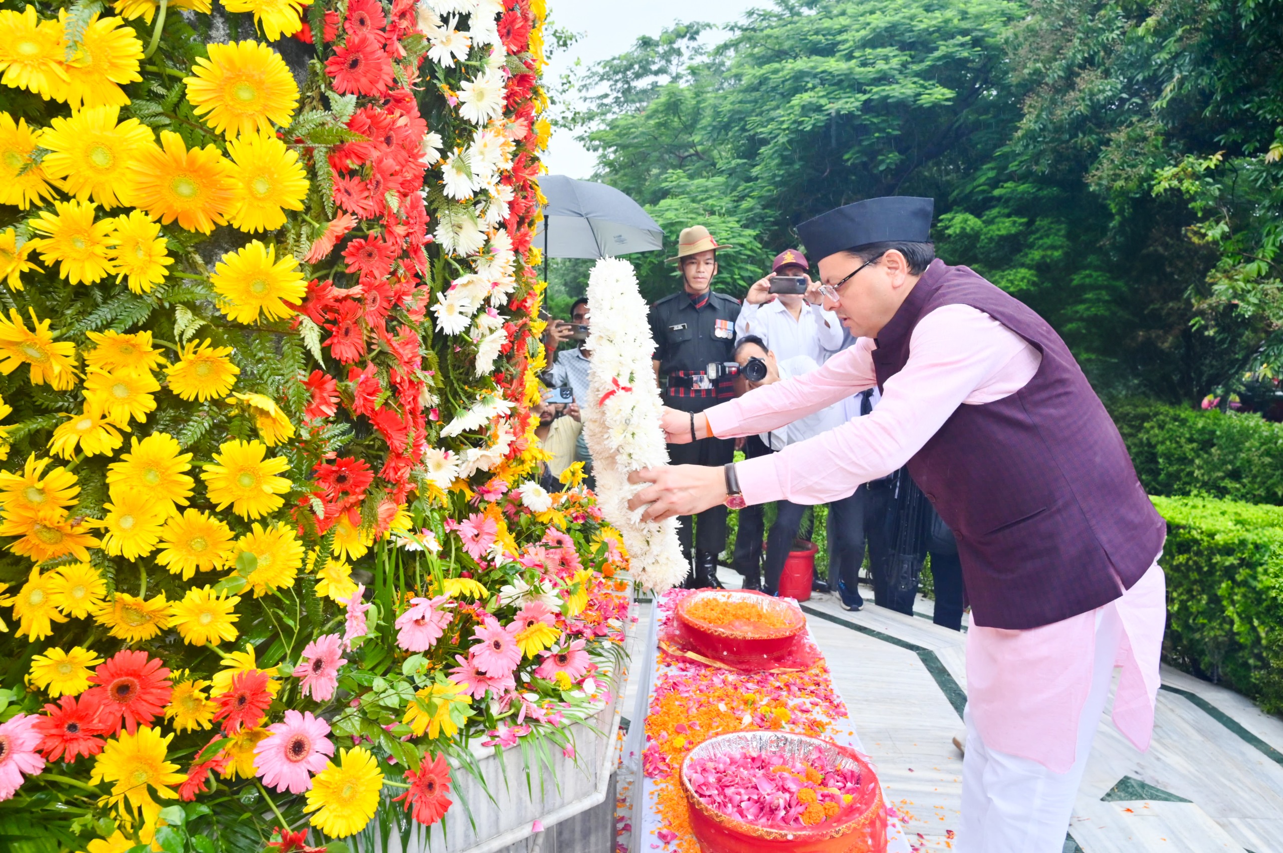 देहरादून : Kargil Vijay Diwas 2024 मुख्यमंत्री श्री पुष्कर सिंह धामी ने कारगिल विजय दिवस (शौर्य दिवस) पर गांधी पार्क में आयोजित कार्यक्रम में शहीद स्मारक पर कारगिल शहीदों को श्रद्धांजलि अर्पित की। मुख्यमंत्री ने कारगिल शहीदों के परिवारजनों को भी सम्मानित किया। इस अवसर पर सैनिक कल्याण मंत्री श्री गणेश जोशी, कैबिनेट मंत्री श्री प्रेमचंद अग्रवाल, विधायक श्रीमती सविता कपूर, श्री बृज भूषण गैरोला और निवर्तमान मेयर श्री सुनील उनियाल गामा ने भी शहीद स्मारक पर कारगिल शहीदों को श्रद्धांजलि दी।